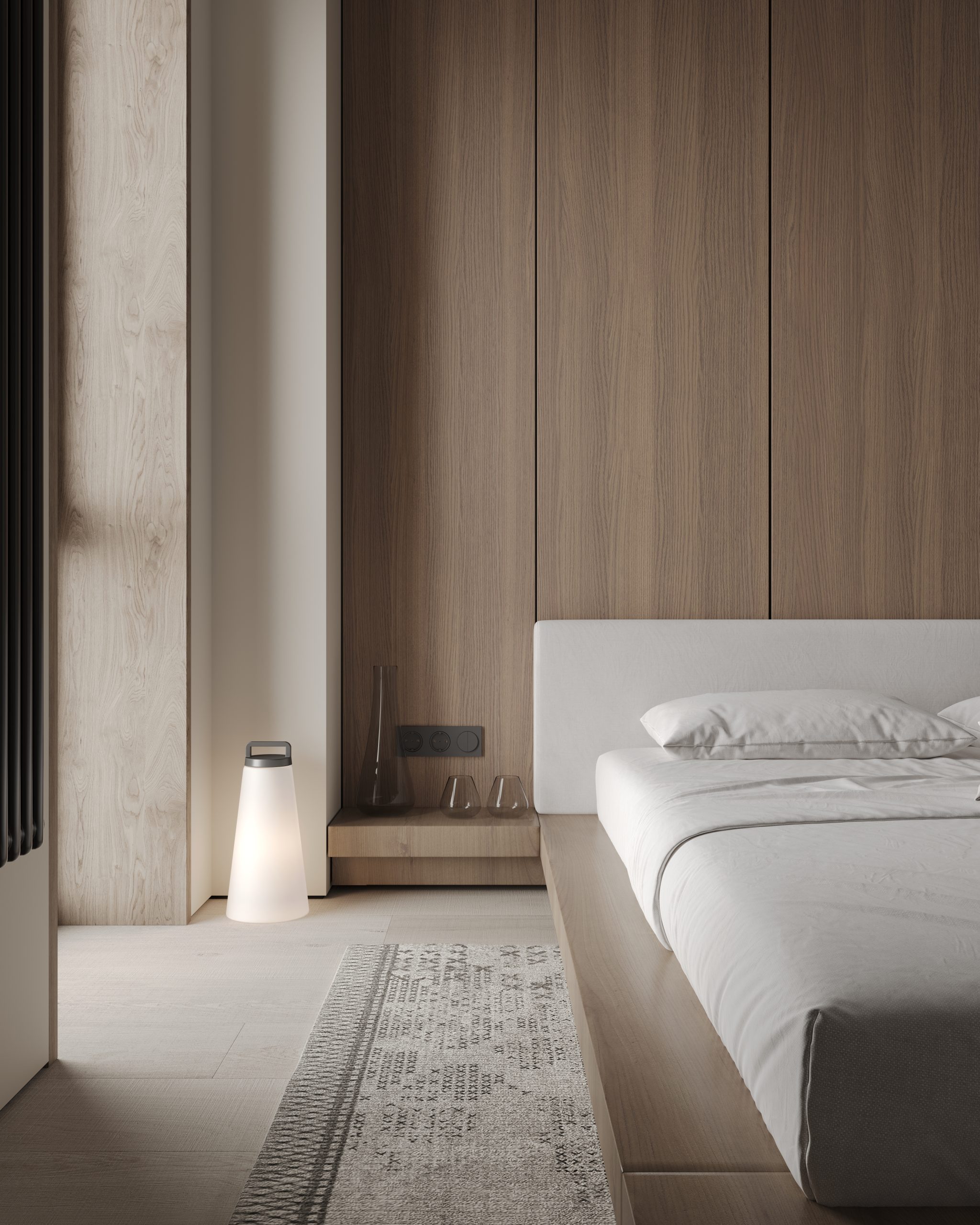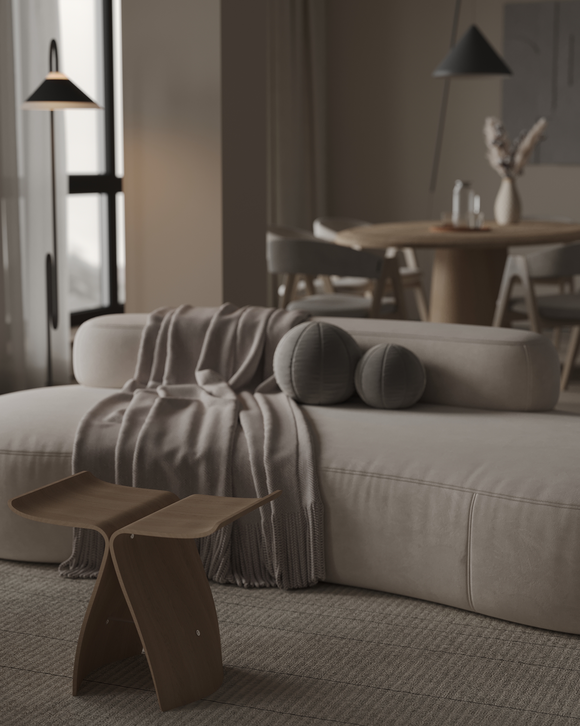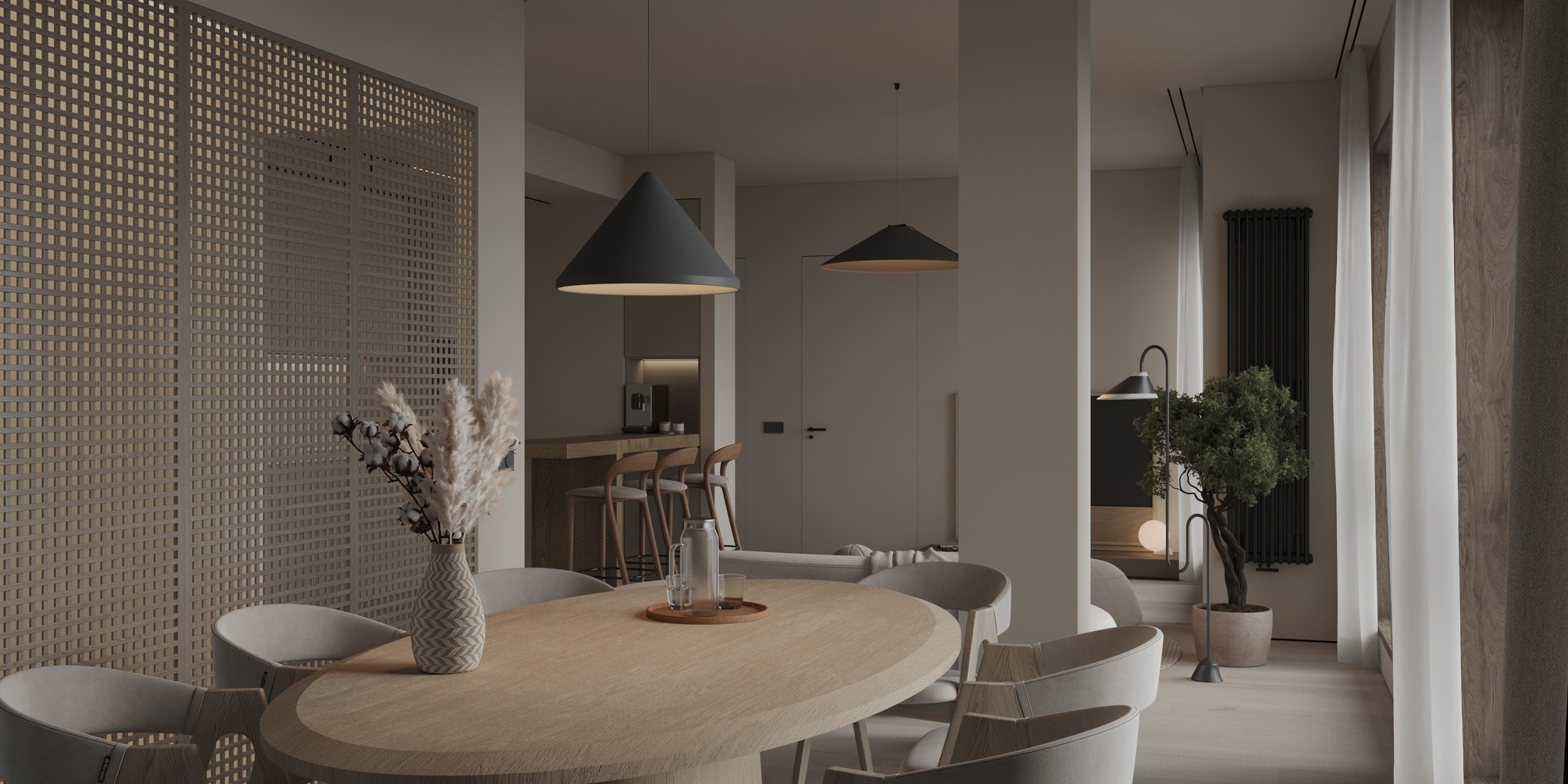 Ons warme, minimalistische interieurconcept, zorgvuldig samengesteld voor demo-appartementen in Riga, Letland.