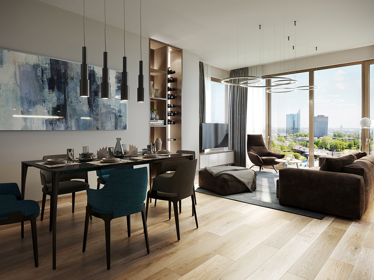 The Philosophers Towers are designed to maximize the stunning views of the Daugava river and the Old Town part of Riga, with large floor-to-ceiling windows in every room. The interior design is done in a contemporary style, combining clean lines, natural materials, and high-end finishes to create a sophisticated and welcoming atmosphere. These luxurious apartments are perfect for those who appreciate the combination of modern design and the beauty of the surrounding nature.